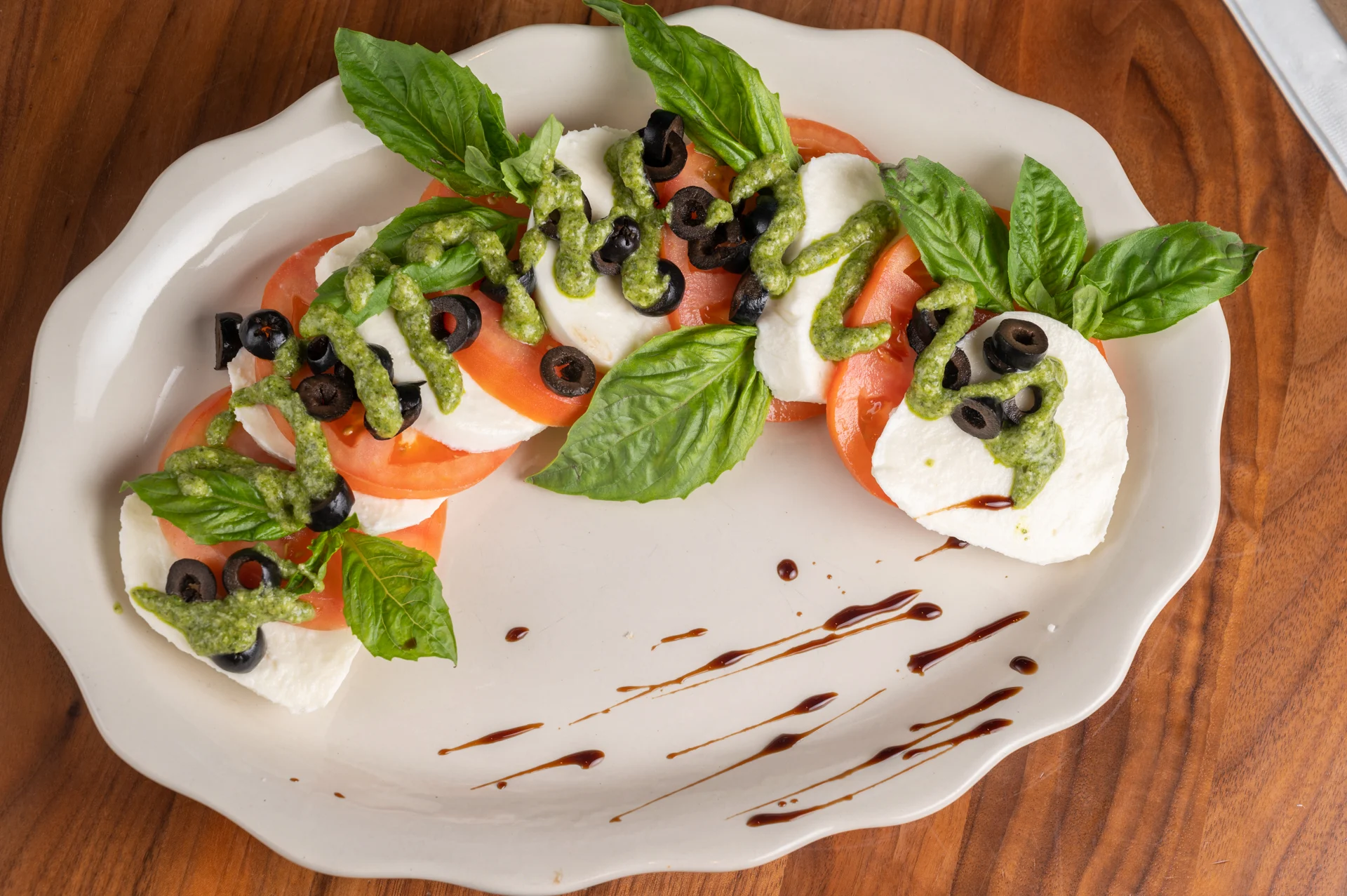 Tomatoes, Mozzarella, Basil, Black Olives, Extra Virgin Olive Oil & Black Pepper