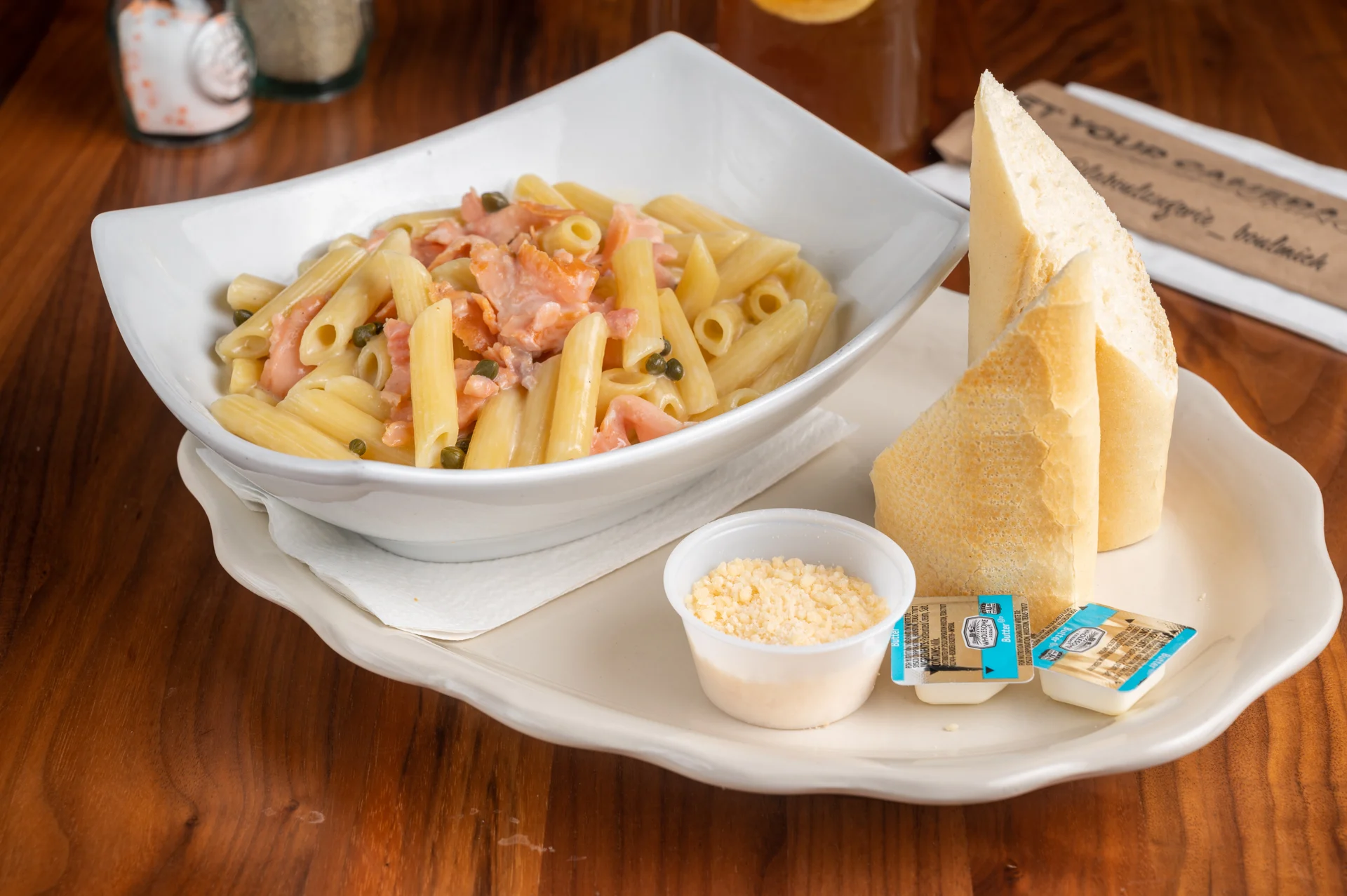 Penne Pasta, Smoked Salmon, Capers and Béchamel Sauce.